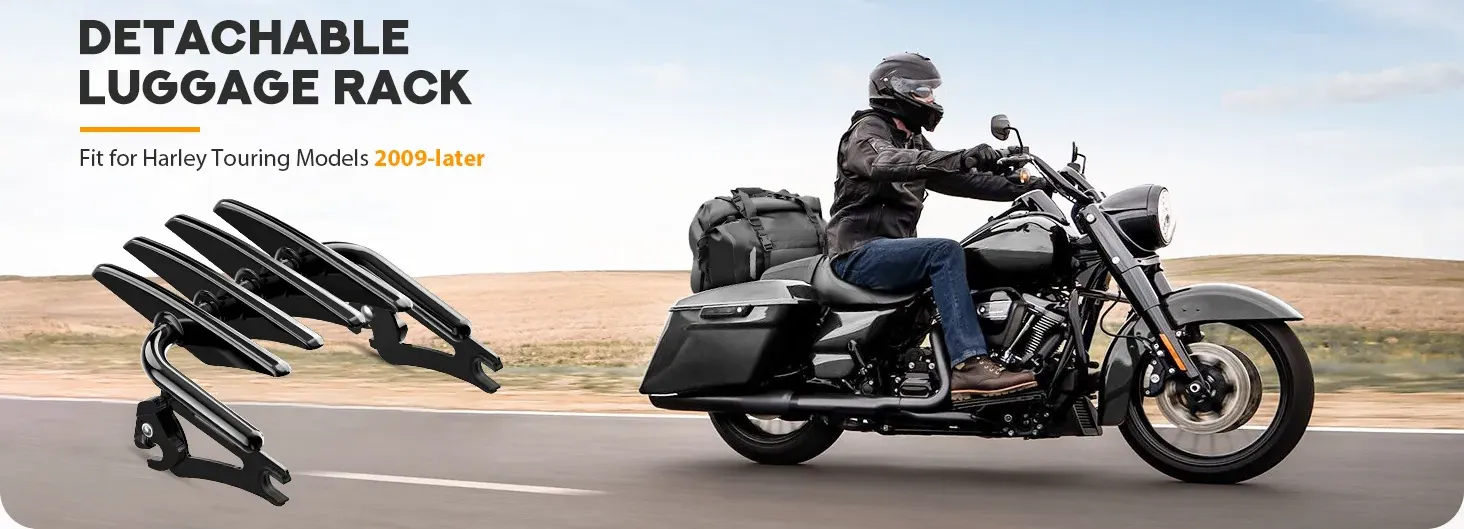 A heavy-duty detachable luggage rack engineered for Harley Davidson Touring motorcycles. Features a sleek low-profile design with robust load capacity.